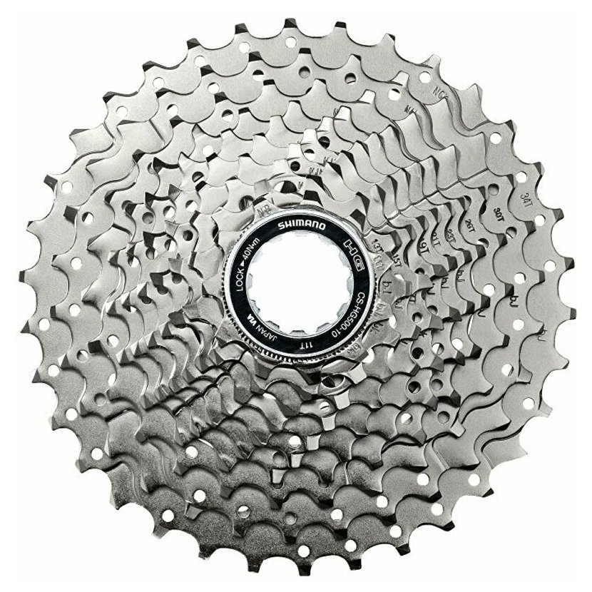 10-ti rychlostní kazeta SHIMANO Deore CS-HG500-10 určená pro MTB kola • univerzální složení pro široké spektrum jízdních stylů • technologie (HG) HYPERGLIDE - typicky tvarované pastorky se speciálně seřazenými náběhovými hranami a profily zubů, zlepšující vedení řetězu při řazení i záběru • náběhy zaručují rychlou a přesnou změnu převodů • lehké provedení, rychlé upevnění • upevnění kazety na ořech náboje maticí center lock - matice je součástí kazety • 10-stupňů poskytuje široký rozsah vhodných převodů • varianta složení pastorků 11-34 zubů (11-13-15-17-19-21-23-26-30-34) • univerzální složení pastorků pro široké spektrum jízdních stylů • pro lepší funkci nabíhání řetězu na pastorky při řazení doporučeno použit originál SHIMANO řetezu HG-X 10 rychlostí • provedení: 10 rychlostí, niklovaný povrch