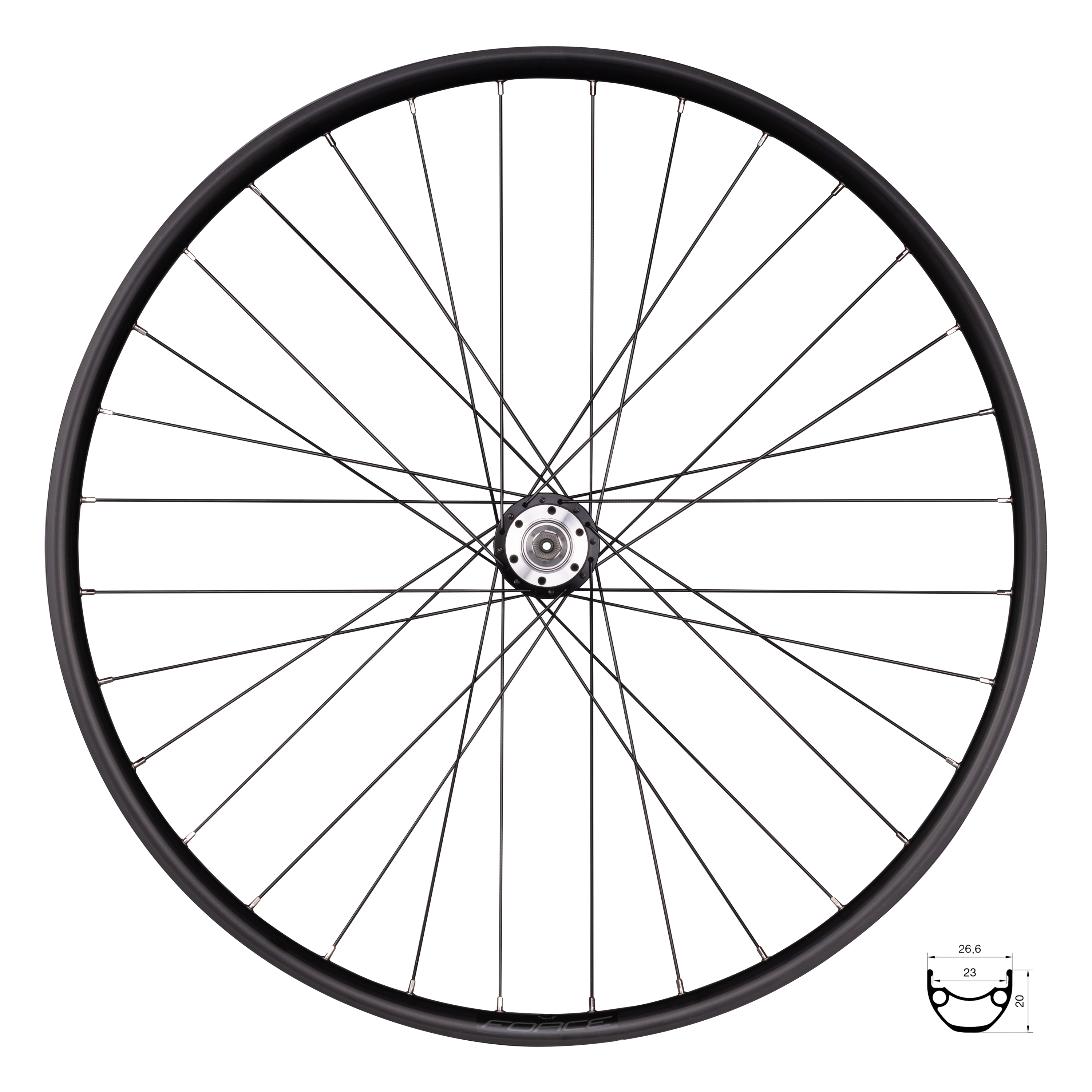 náboj FORCE 804341 pro 6 děrové brzdové kotouče průmyslová ložiska, osa: 3/8" x 145 x 135 mm, včetně rychloupínáku kompatibilní pro SHIMANO MTB kazety 8 - 11 pastorků ráfek 29" FORCE XC DISC 622x23, tubeless ready 32 děr, jednoduché nýty výška ráfku: 20 mm, otvor pro ventilek: 8,5 mm materiál ráfku: Al hliník, černý materiál drátů: nerez, černé hmotnost: 1 330 g včetně rychloupínáku
